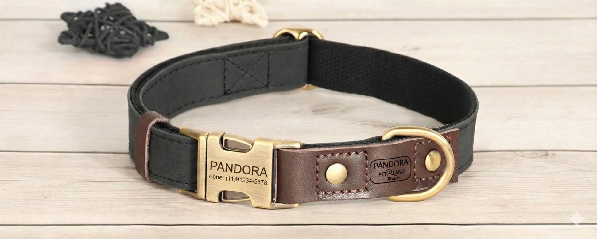 Apresentamos a Coleira Premium Pandora Gold Edition, a fusão perfeita entre a segurança robusta que você exige e o design luxuoso que seu pet merece. Esqueça as coleiras de nylon comuns que desbotam e desfiam. Estamos falando de um acessório definitivo.
